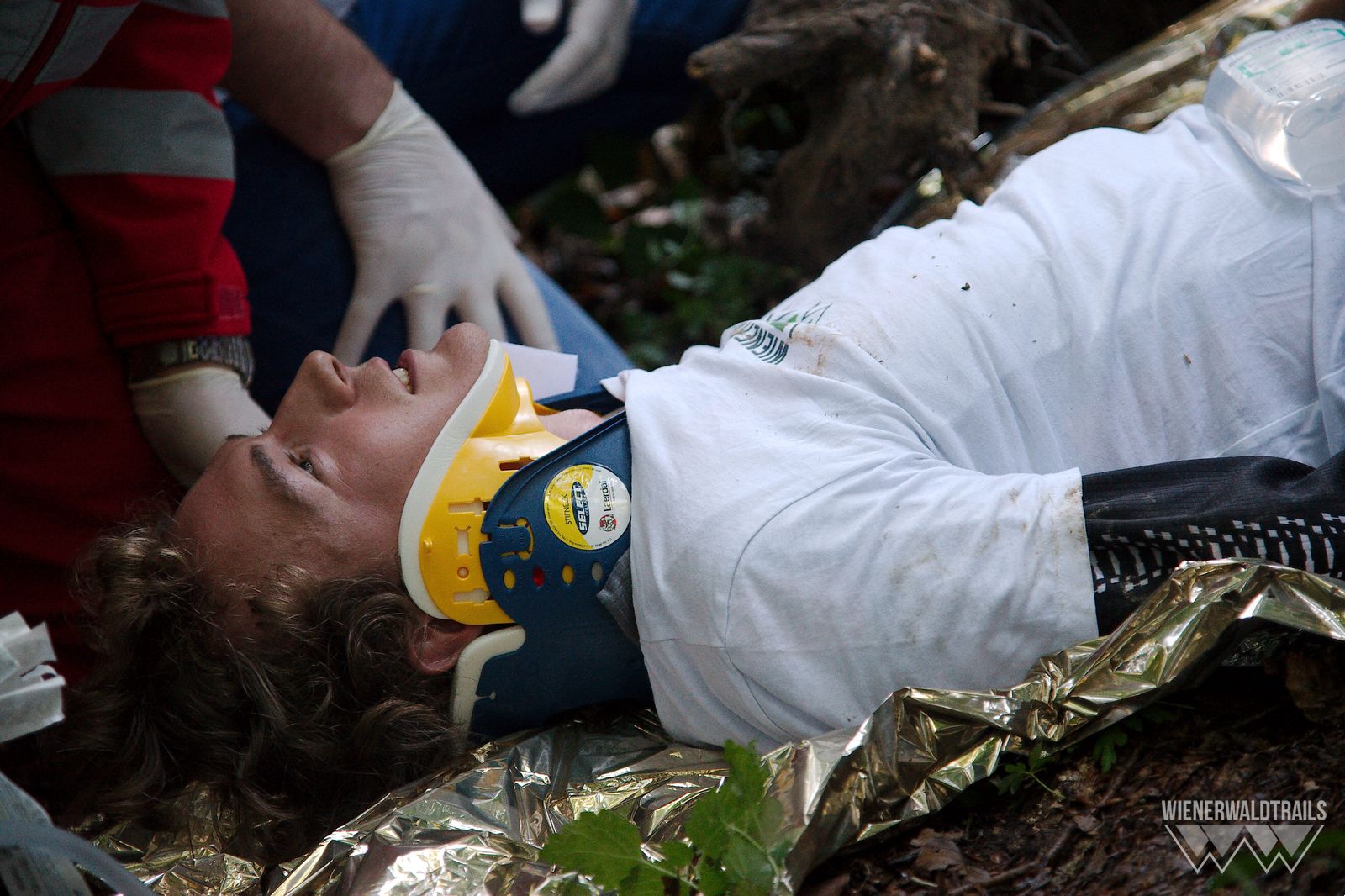 Ich war überrascht wie viele Personen um mich herum standen. Ich sah zwar nur ein paar Köpfe, da ich schnell ein Stiff-Neck angelegt bekam und somit nur senkrecht nach oben schauen konnte. Aja, meine Beine spürte ich natürlich nicht, Wirbelsäulenverletzung vorspielen war meine Aufgabe. Somit bekam ich das meiste nur akustisch mit, wie gesagt viele Stimmen die ich versuchte langsam zuzuordnen. Gesehen hab ich eigentlich nur zwei Sanis, den einen, der fast immer brav meinen Kopf stützte und einen anderen, der mir ständig irgendwelche lästigen Fragen stellte 🙂