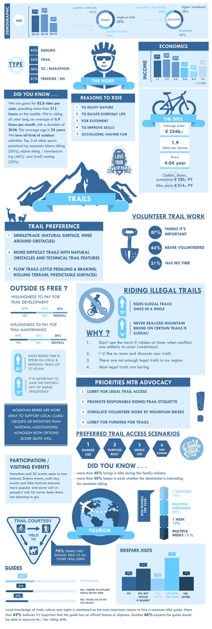 Die IMBA Europe hat dieses Jahr erstmalig eine gross angelegte, mehrsprachige Umfrage unter Mountainbikern gestartet um deren Umfeld, Wünsche und Präferenzen besser zu verstehen. Das Ergebnis der über 60 Fragen umfassenden Erhebung wurde jetzt in einer informativen Grafik zusammengefasst, die einen guten Einblick in „die Seele“ der europäischen Mountainbiker gibt: